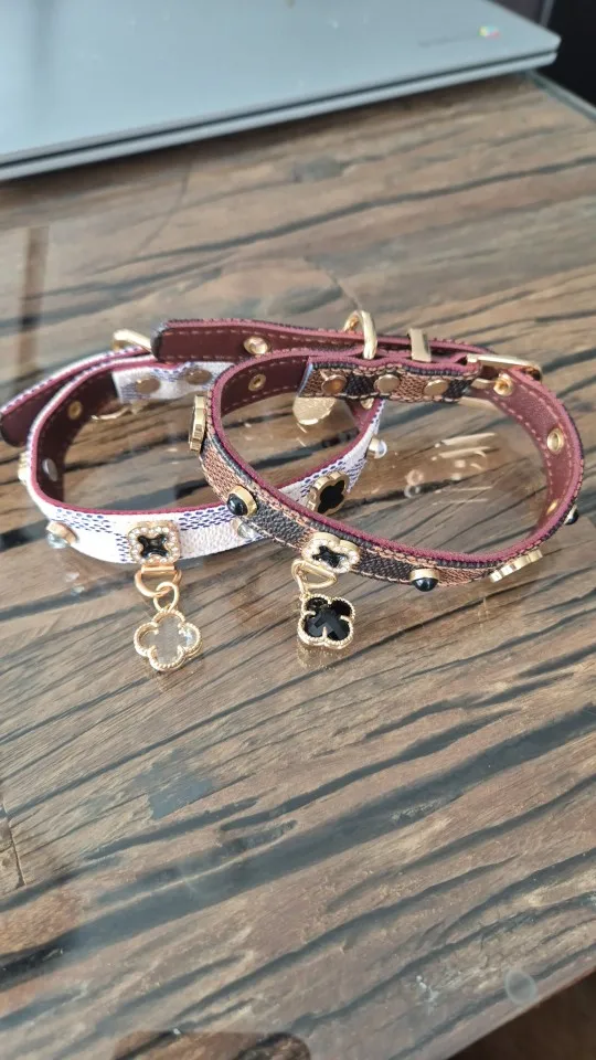 Add a touch of elegance to your dog’s look with this designer plaid dog collar. Made for extra small and small breeds, it combines a classic plaid pattern with golden accents, rhinestones, and a lucky clover charm.
