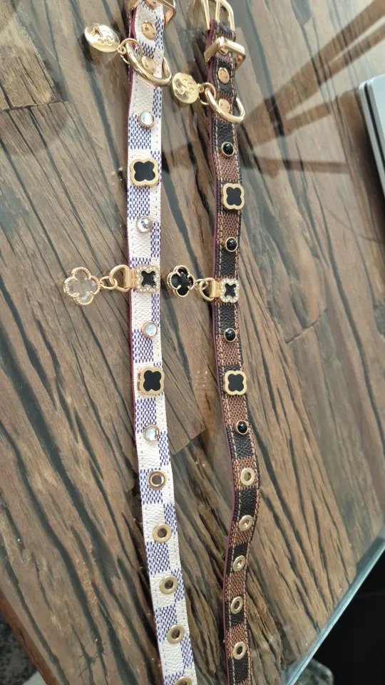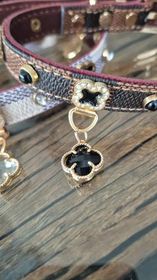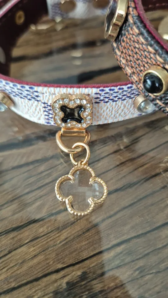 The collar features a stylish plaid print that pairs beautifully with sparkling rhinestones. A golden buckle and hardware add refinement, while the clover pendant charm gives a unique finishing touch.